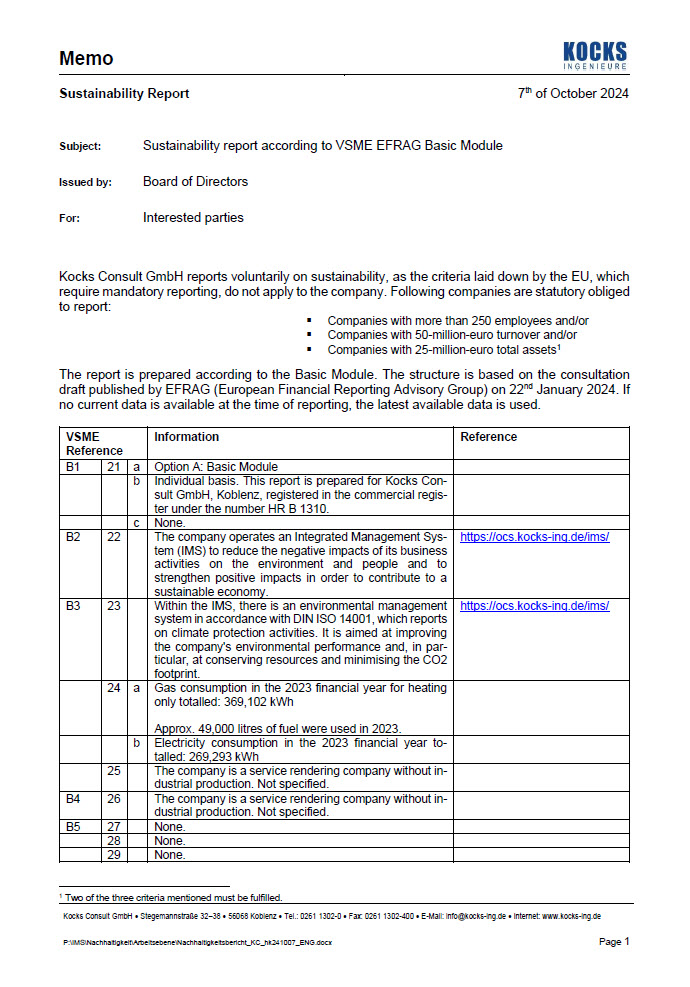 KOCK ENIGNEERS run an Integrated Management System (IMS) to assure efficient and quality controlled services that are rendered in a save and secure working environment. In addition, emphasis is placed on protecting the environment, sustainability and performing to highest ethical standards. The IMS handbook provides an overview of the high level structure and its supporting management systems at the core of which stands the quality management according to DIN ISO 9001 that has been externally audited and accredited since 2006. Next to it there are management systems relating to environmental protection according to DIN ISO 14001, save working conditions, compliance and sustainability. Managing and developing the IMS is the responsibility of four dedicated members of the company’s Policy Council.